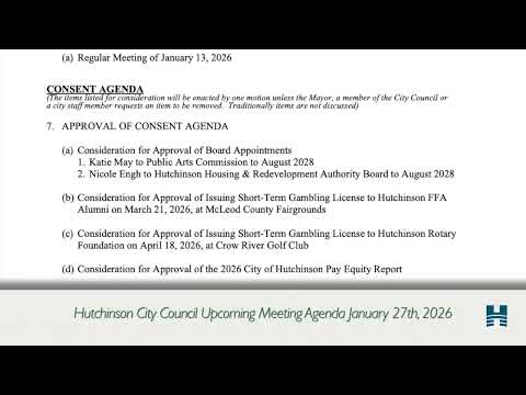 Magionic, Hutchinson City Administrator, said the council will consider an energy management agreement related to the city's solar array projects and will review a cross-easement agreement with Cassell Holdings tied to a property swap.