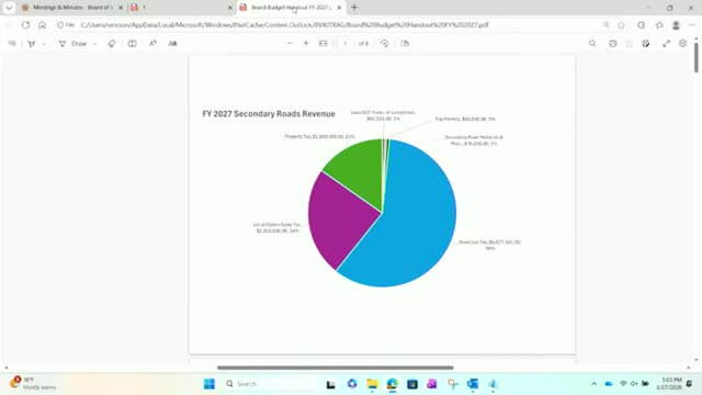 Secondary roads staff presented the proposed FY27 secondary roads budget and outline of a multi‑year gravel road project on Monday, saying the department needs new equipment and bridge replacements to maintain progress.