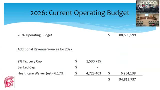 S5 said the state allows a limited set of waivers beyond the 2% tax levy cap, including a health‑care waiver. “If the board were to allow us to take the full 4,700,000.0, that would be the 2% cap plus another 6.17 or an increase in the rate of approximately 8%,” S5 said, describing how the waiver would combine with the 2% levy cap. She presented a slide showing health‑benefit costs rising markedly in recent years: about $16.7 million in the 2024–25 school year, a figure near $19.08 million in the current reporting year, an estimate near $26.5 million in the next year, and an estimated $35 million for 2027–28.