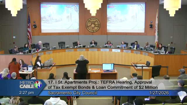 Council approved staff recommendations to authorize tax-exempt mortgage revenue bonds and a $2,000,000 PLHA loan for an 8-story, 84-unit I Street Apartments project serving households at approximately 30–80% AMI; Council directed follow-up design review and entitlements.