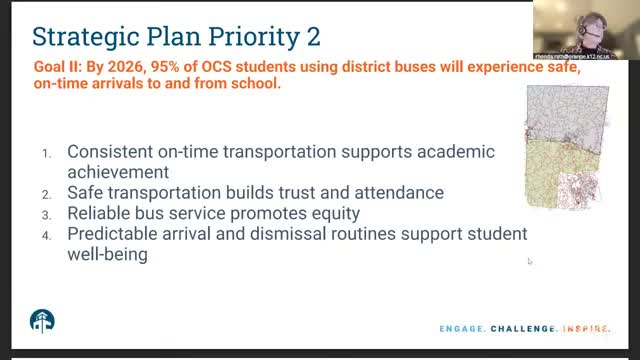 The district set a target that by 2026, 95% of OCS students who use district buses will experience safe, on-time arrivals. Staff said the approach includes installing real-time bus tracking and turn-by-turn GPS for all buses, adding cameras for visual safety, strengthening driver recruitment and retention (including updated substitute-driver pay), route optimization and exploring EV buses and other equipment upgrades. Staff noted a recent GPS rollout and approved substitute-driver pay to improve retention.