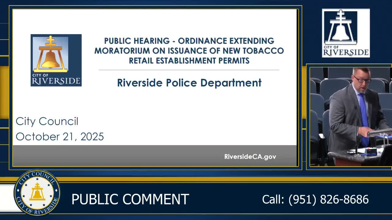 The Riverside City Council unanimously voted Tuesday to extend an emergency moratorium on issuing new tobacco retail establishment permits for an additional 10 months and 15 days, continuing a pause originally enacted as a 45-day urgency ordinance.