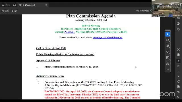 The Middleton Plan Commission on Jan. 27 reviewed a draft housing action plan that staff and volunteer committees say is designed to guide spending of an extension to Tax Increment District No. 3 and to align city strategy with Dane County goals.