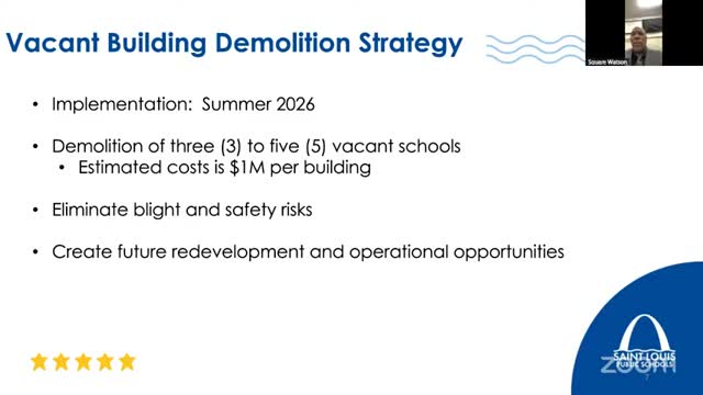 The district presented recommended criteria and a shortlist of closed buildings for possible demolition — Scullin, Walnut Park, Hempstead, Gunlock, Stowe and Euclid — and said each demolition could cost roughly $1 million; the RFPs will include salvage requirements and community reuse planning with City partners.