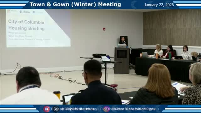 DreamKey Partners told the City of Columbia Town & Gown Committee that its 2025 outreach and survey found elevated housing instability (reported as 35%) and community concerns that off‑campus student housing and investor conversions are pushing rents; the group urged aligning university growth plans with housing strategy.