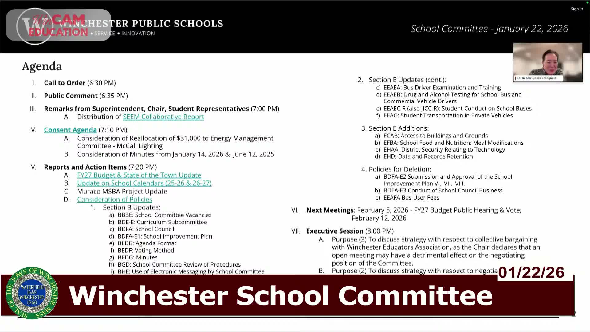 At its Jan. 22 meeting the School Committee approved a consent-agenda reallocation of $31,000 to an LED lighting project at McCall (pending award), approved a calendar change (making March 3 a half student day) and adopted Section B and E policy updates; all recorded votes were unanimous.