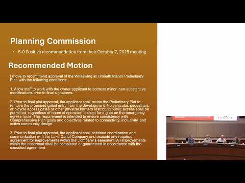 The Timnath Town Council approved the White Wing at Timnath Manor preliminary plat 3–1 on Jan. 27, requiring the applicant to remove the proposed gated vehicular entry and satisfy other staff conditions before final plat approval.