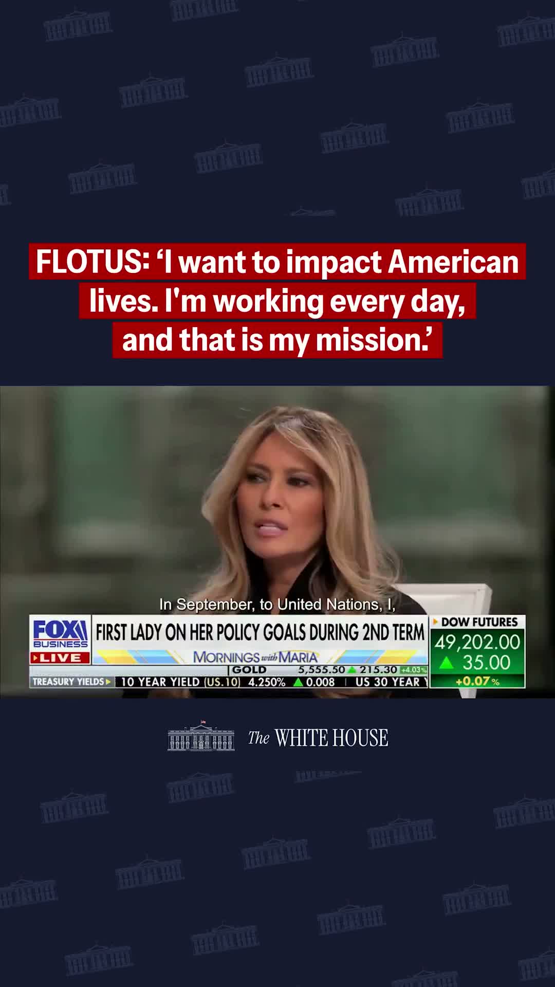 The exchange began with another unidentified speaker noting a leadership role "in terms of other first ladies across the world" and stating that the subject had "welcomed them to the White House to try to affect change." The primary speaker responded: "In September, at United Nations, I established Fostering the Future Together Coalition Worldwide, so that will be, the event and the summit in the White House."