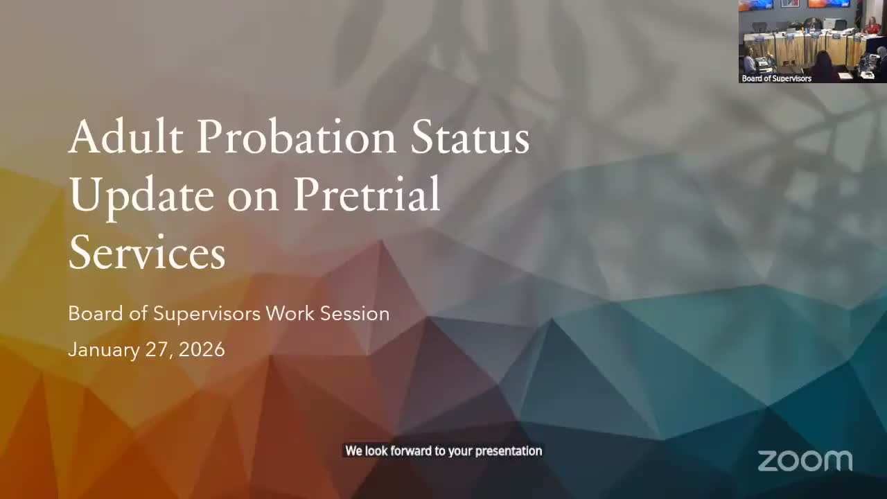 Chief Adult Probation Officer Kara Singer and Presiding Judge Reed told supervisors that pretrial services remain at a reduced level because of staffing shortages and uncertain fee-based revenue; state-level probation funding shortfalls may reduce local capacity without contingency planning.