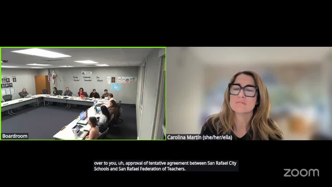 Trustees approved a tentative agreement with the San Rafael Federation of Teachers that provides a 1.65% salary increase (0.7% ongoing; 0.95% one-time); the Marin County Office of Education cleared the AB 1200 review.