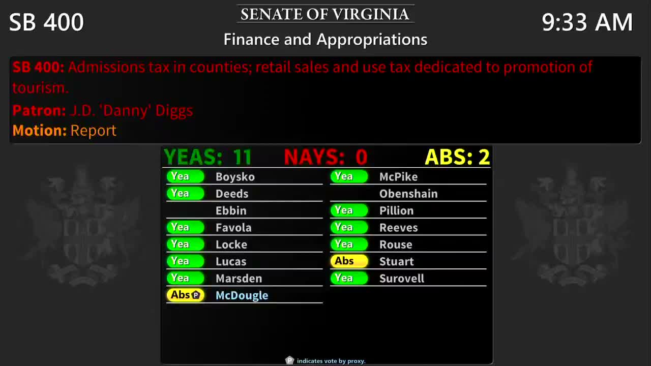 - SB400 (admissions tax prohibition for York and James City counties): reported to the full Senate, recorded vote 11 yes, 0 no, 2 abstentions (committee report recorded in transcript).