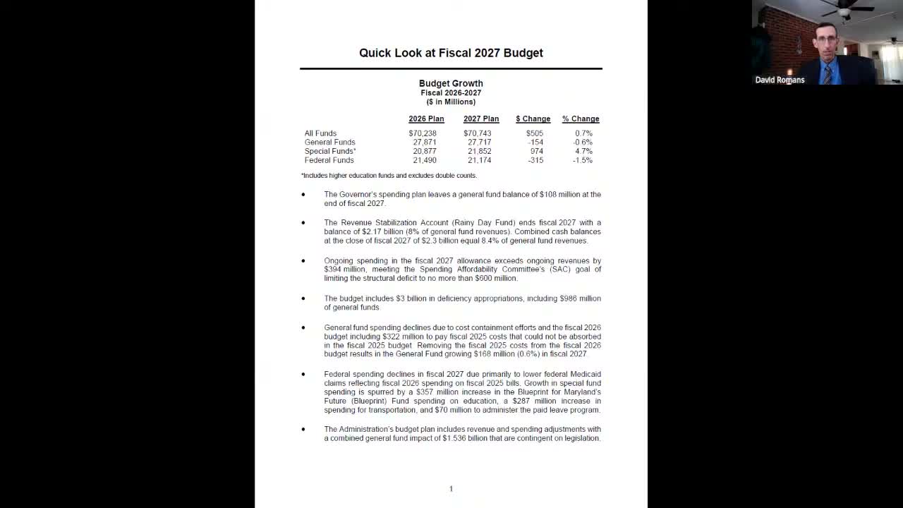 The Budget and Taxation Committee received an overview of the governor's proposed fiscal 2027 budget, which the Department of Legislative Services staff said improves the short-term outlook but does not resolve long-term structural shortfalls.