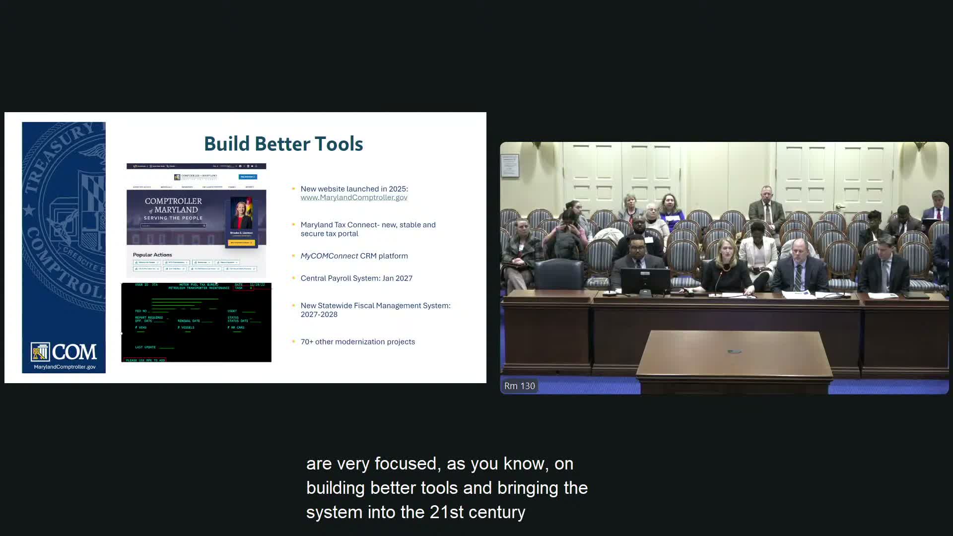 “We've launched Maryland Tax Connect, a new stable and secure tax portal for our businesses in February 2024,” Lierman said, and the office plans to migrate personal tax filings to Maryland Tax Connect in August. She described other modernization steps: a new CRM platform, a central payroll system planned for next January, and a new website.