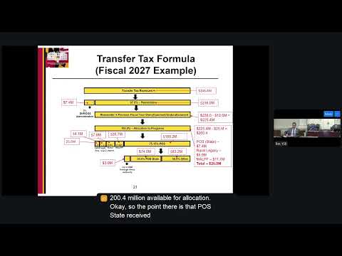 - Program Open Space (POS) and transfer-tax allocations: Gray reviewed the POS formula and said the governor's budget proposes a $25 million diversion of transfer-tax proceeds to the general fund (a permanent allocation under current law) and a separate swap that replaces a $71.9 million special-fund transfer with general-obligation bonds in FY27. He showed how transfer-tax revenue is filtered (three percent for administration, adjustments for underattainment, then statutory allocations to state POS, local POS, rural legacy, heritage areas and other line items).