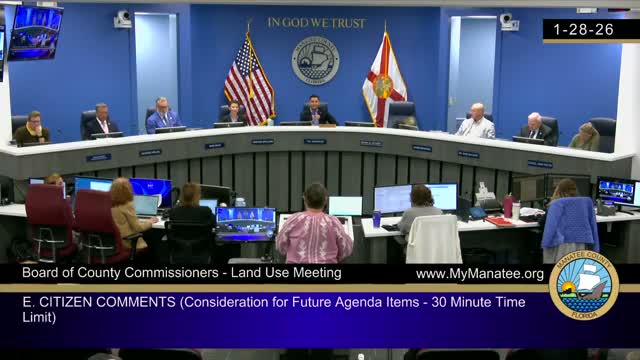 Speakers said the land is now zoned low‑intensity residential (Res‑1) and protected by the county’s comprehensive plan, and that industrial zoning would be inconsistent with nearby conservation areas and longstanding local expectations. "Industrial zoning is intended for heavy infrastructure, freight movement and continuous operations — those uses are not compatible with residential communities like Palmetto Point nor with an aquatic preserve," said Elaine Johnson, a Terracea resident.