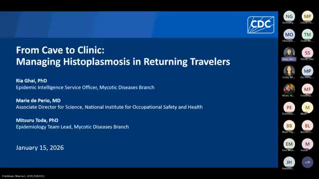 CDC presenters described three 2025 travel-associated histoplasmosis outbreaks linked to bat-inhabited caves (Puerto Rico, Costa Rica, Belize), documented high attack rates and common misdiagnosis with antibiotics or steroids, and urged clinicians to consider fungal testing and counsel workers and travelers on exposure controls.