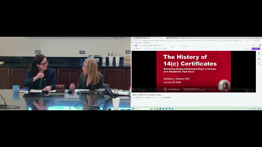The task force’s opening presentation was a recorded overview by Kim Losmani of Cornell University’s Yang Tan Institute, who summarized the legal and historical context for 14(c) certificates under the Fair Labor Standards Act. Losmani told the group that 14(c) dates to the 1938 law and that national use of certificates peaked historically but has fallen: roughly 141,000 workers were paid under certificates in 2018 and about 36,000 in 2025, according to federal data she cited. She described changes under the Workforce Innovation and Opportunity Act (WIOA, reauthorized 2014) that require transition services and vocational rehabilitation steps before students can pursue subminimum‑wage employment, and warned that states that phase out certificates have sometimes seen mixed outcomes, including many people moving into day habilitation or leaving the workforce altogether.