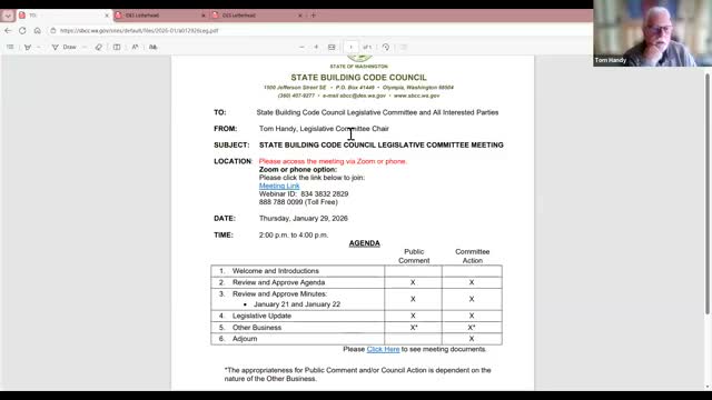 At its Jan. 29 legislative committee meeting, the State Building Code Council reviewed bills on embodied carbon, kit homes, wildfire risk maps and an energy-cost bill (2486) that members said could undercut the state's energy goals; the council agreed to provide targeted written and oral comments to the Legislature.