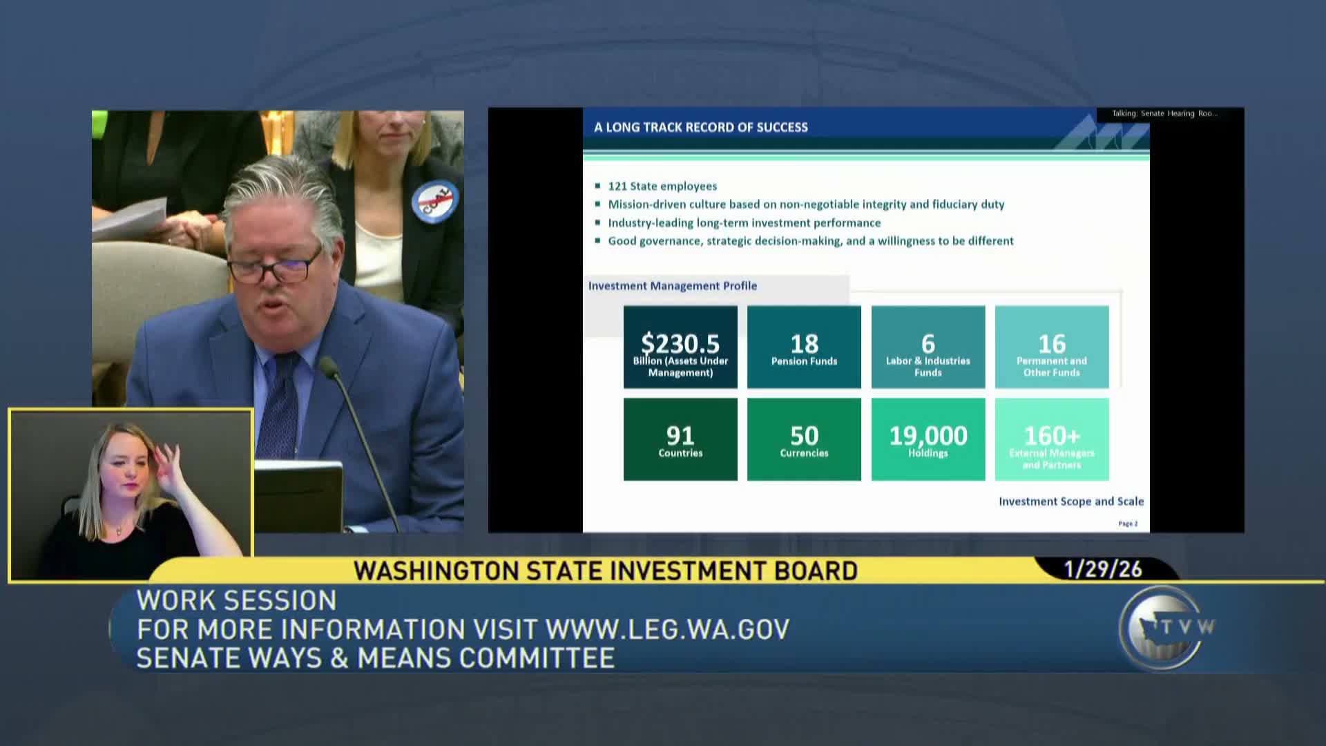 Washington State Investment Board officials told the Senate Ways and Means Committee that SIB manages about $230 billion, primarily in pension funds, relies heavily on passive index vehicles to control fees, and integrates ESG considerations through proxy voting and stewardship while warning that imposed divestment mandates could raise costs.