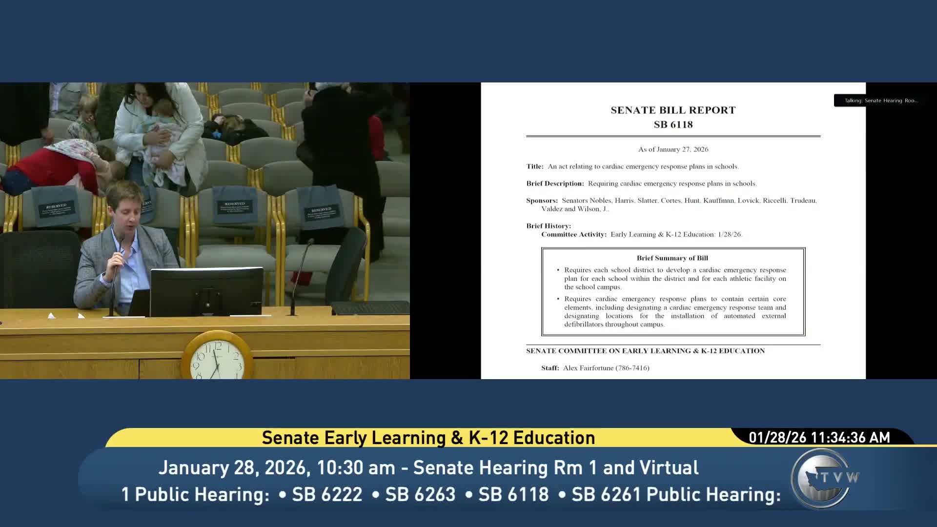 SB 6,118 would require school districts to adopt cardiac emergency response plans, designate response teams, and place AEDs to allow retrieval within three minutes. Witnesses told personal stories of cardiac emergencies to urge adoption and training; staff estimated potential implementation costs but the sponsor plans a substitute to reduce financial mandates.