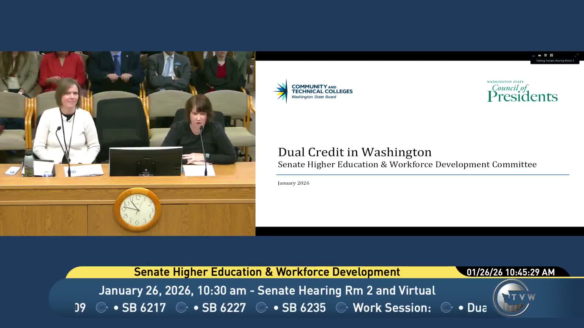 Presenters from the Council of Presidents, State Board for Community and Technical Colleges and ERDC told the Senate Higher Education Committee that dual credit participation is widespread in Washington and linked to higher postsecondary enrollment and credential attainment, while noting gaps in funding, equity, advising, and data.