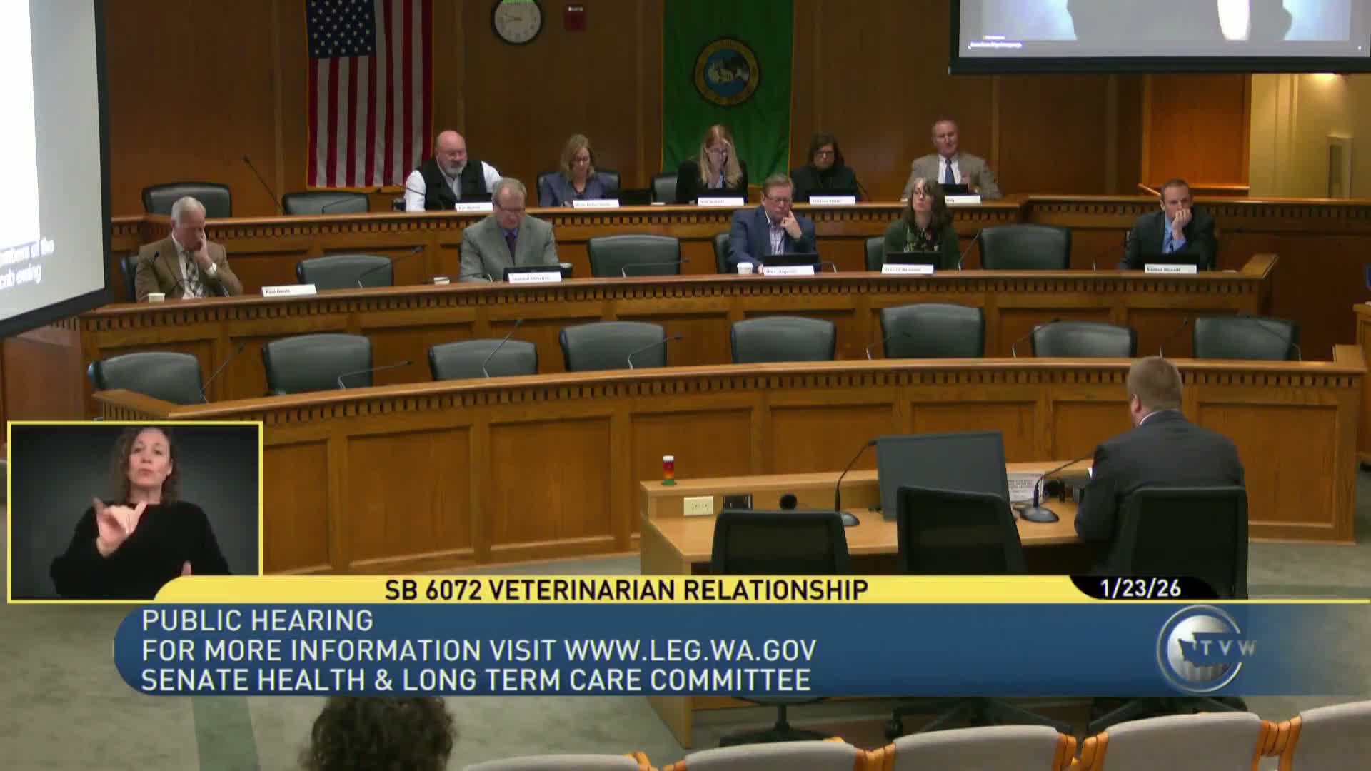 Senate Bill 6,072, considered by the Health and Long Term Care Committee on Jan. 23, would establish conditions under which a veterinarian‑client‑patient relationship (VCPR) exists and allow telemedicine to be used for ongoing care in specified circumstances.