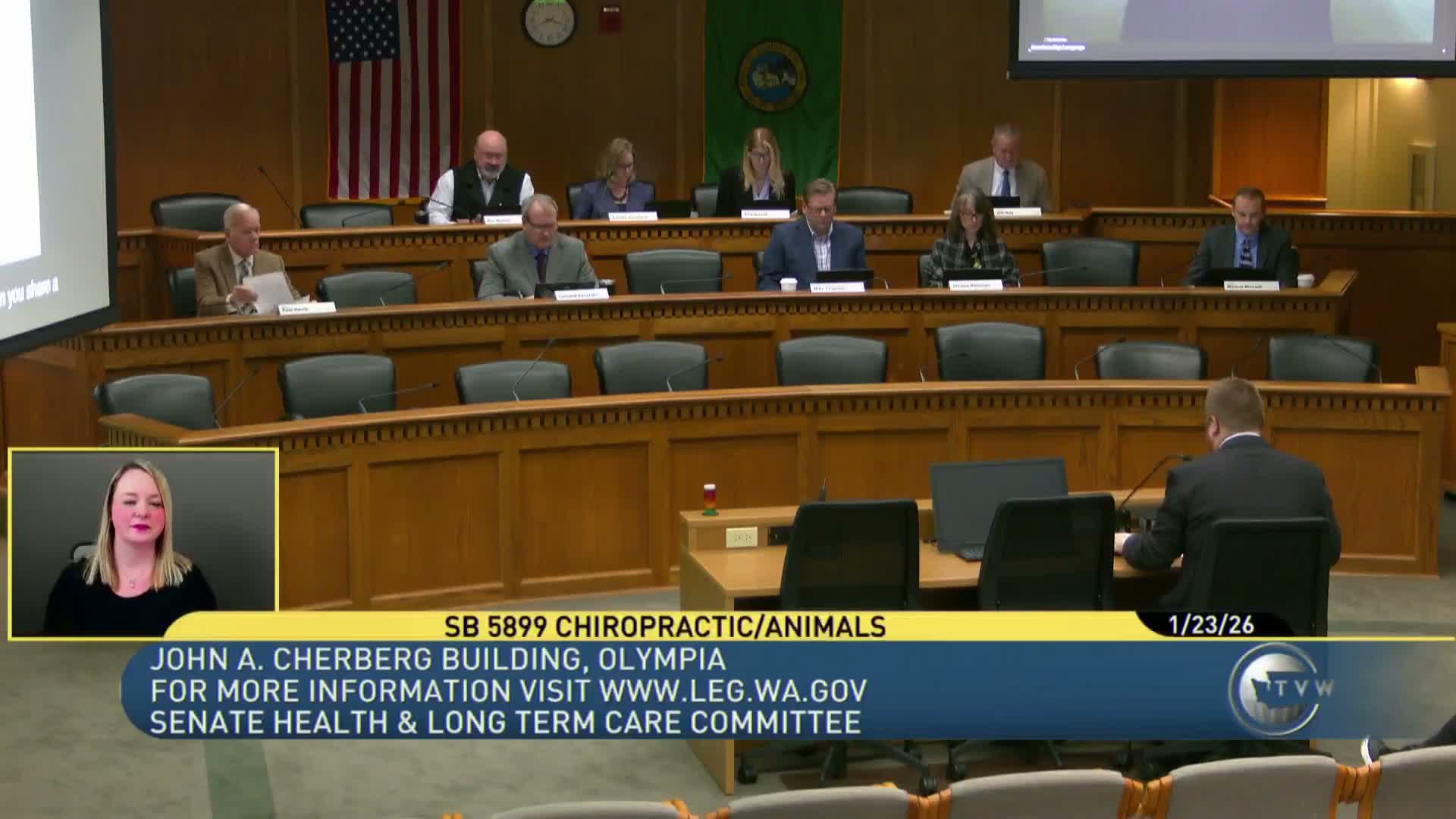 Senate Health and Long Term Care Committee members on Jan. 23 heard testimony for and against Senate Bill 5,899, which would create a three‑year animal chiropractic endorsement allowing licensed chiropractors who complete approved animal chiropractic training to perform chiropractic diagnosis and adjustments on non‑human animals.