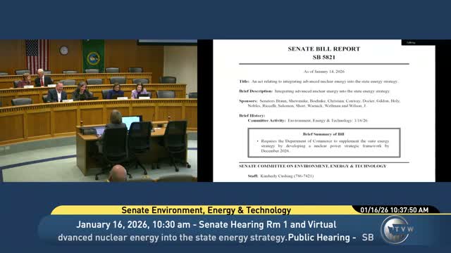 The Washington Senate Environment, Energy and Technology Committee heard hours of testimony on Senate Bill 58-21, which would direct the Department of Commerce to develop a nuclear power strategic framework — contingent on sufficient outside funding and with a required publication target in 2026. Kim Cutching, staff to the committee, summarized the bill as requiring Commerce to outline processes for financing, siting, permitting, tribal consultation and workforce needs and to integrate the framework into the state energy strategy.