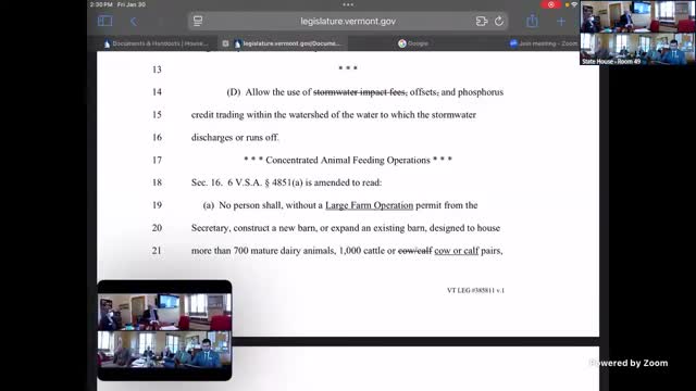 "Unbeknownst to you all and to me as well, apparently, EPA provided some input on the language last year, and it didn't make it into your bill last year. And this is being offered to reconcile what EPA requested," the speaker said, summarizing why changes were needed. Key points the committee discussed included which agency has permitting authority for discharges (the Agency of Natural Resources for NPDES permits), whether language granting the secretary discretion to require a CAFO permit should remain, and a now-agreed plan to remove or reword problematic language the Agency of Agriculture had requested be deleted.