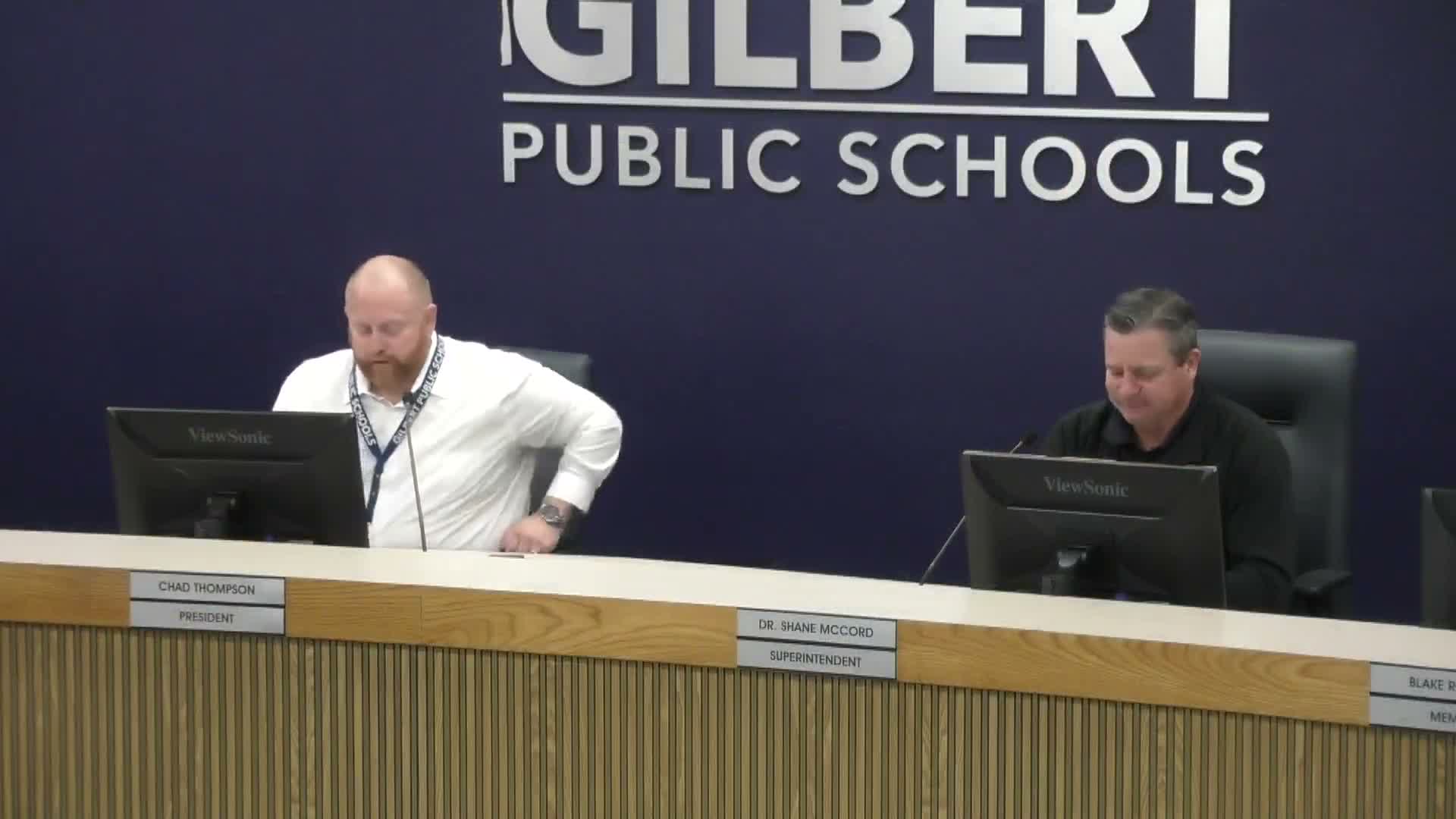 The Gilbert Public Schools governing board voted unanimously to approve Dr. Jared Ryan as superintendent, pending execution of a contract; outgoing Superintendent Dr. McCord endorsed Ryan and Ryan delivered remarks accepting the appointment.