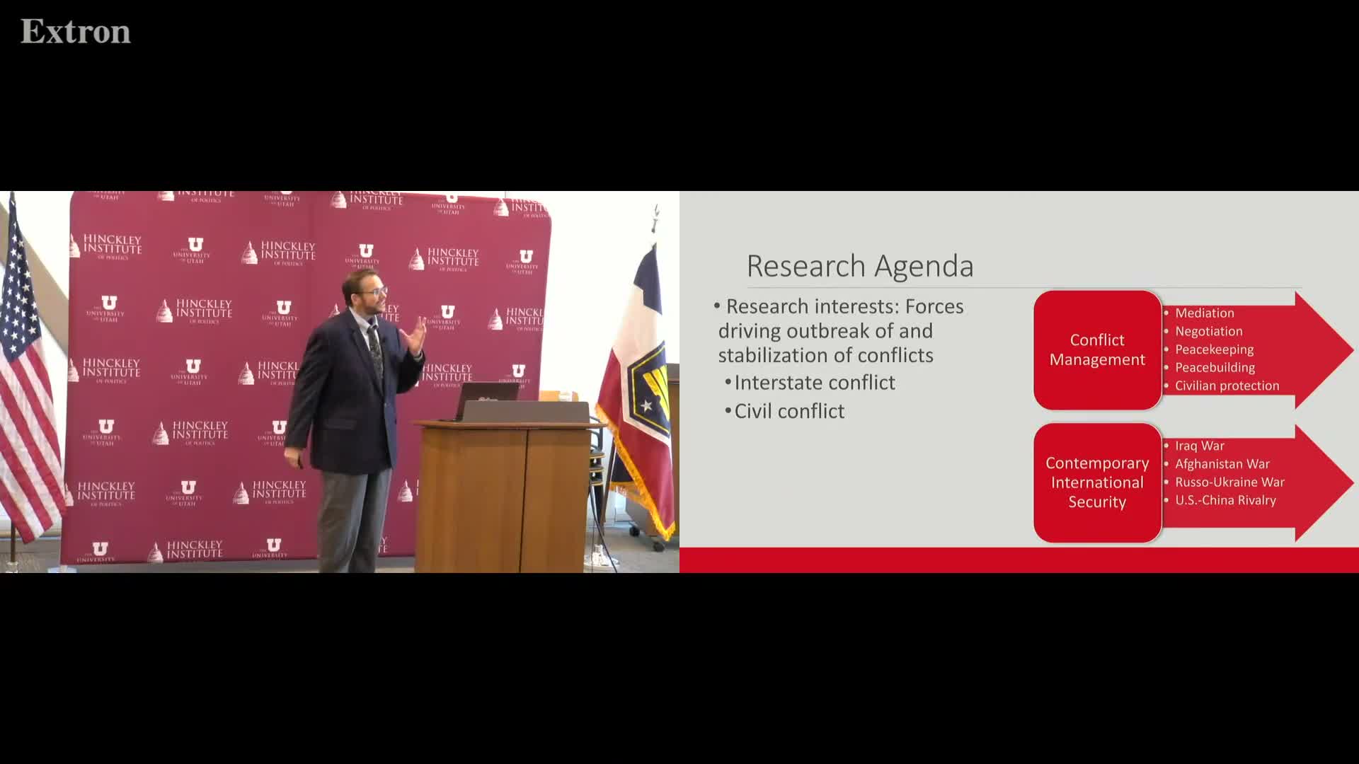Michael Gregg, a candidate for professor and department chair, told attendees at a Hinckley Institute of Politics presentation that his research focuses on what drives the outbreak and stabilization of conflict and how those forces shape combat and civilian outcomes. Gregg, who said he currently serves as associate chair for international studies at the University of North Texas, described two main research agendas: conflict management (mediation, peacekeeping and civilian protection) and contemporary security (corruption and military effectiveness).