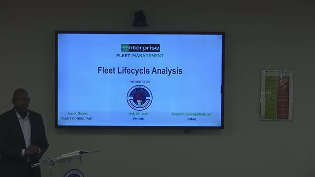 Jean Renee Bordes, an Enterprise account lead, presented fleet diagnostics showing 241 vehicles with an average age near 10 years; 42% of the fleet predates standard safety features such as backup cameras, automatic emergency braking and electronic stability control. Bordes said aging vehicles increase repair costs, reduce fuel efficiency, and erode resale equity.