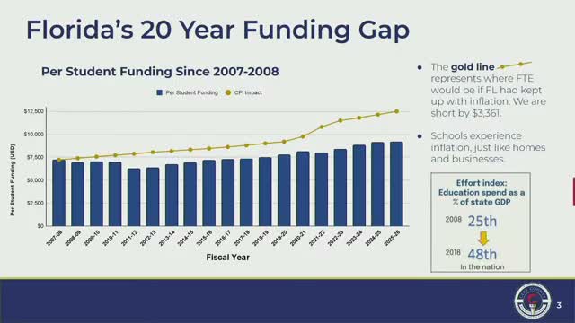 Brodsky said statewide shifts have left Florida among the lower tiers of per‑pupil funding and that an Auditor General review of the voucher program raised accountability concerns. Locally, he reported about 4,500 Clay County students use vouchers, and roughly 4,000 of those students have never attended Clay County Public Schools, a dynamic he said diverts about $30 million annually from district classrooms to private school vouchers.