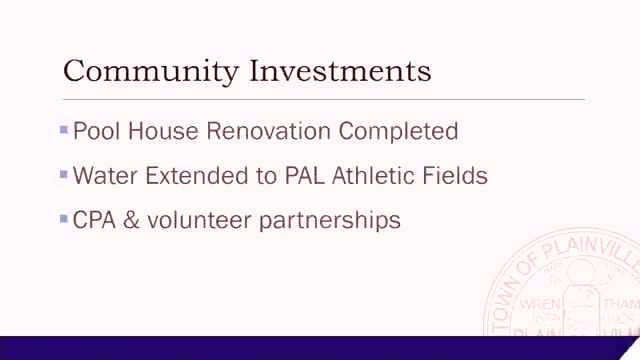 The address noted completion of a pool house remodel and expansion intended to make the facility safer and more functional for residents. The speaker also said town water was extended to the Plainville Athletic League fields using CPA funding and volunteer support from local businesses.