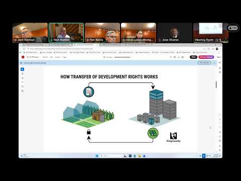 He described operational approaches King County uses: a private-market exchange where buyers and sellers can list credits, and a King County TDR Bank that purchases credits up front and holds inventory so developers can buy without assembling many individual transactions. Bratton said interlocal agreements with partner cities and a revenue-sharing arrangement also help create demand and fund local infrastructure needs.