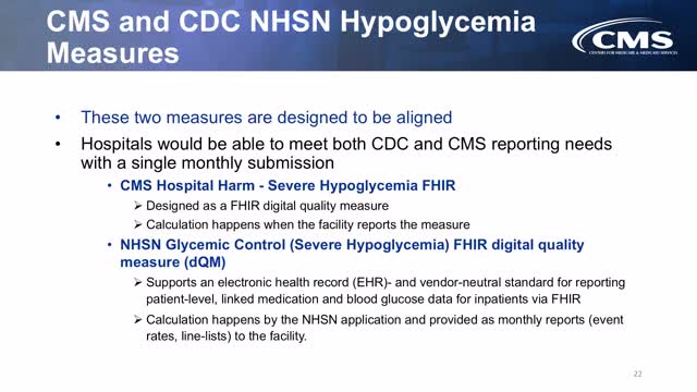 CMS detailed a collaboration with CDC (NHSN) to align severe hypoglycemia digital quality measures for inpatient settings and said CMS may allow hospitals to report via the NHSN FHIR pathway to reduce provider burden and support surveillance.