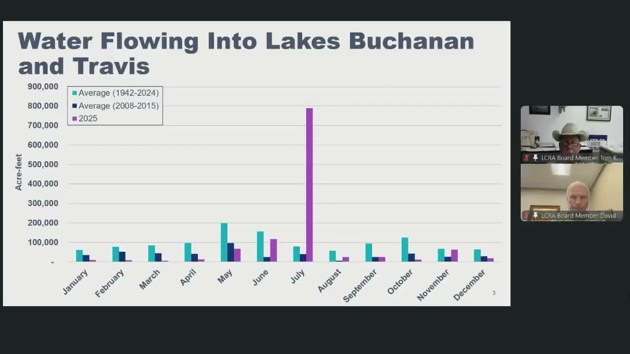Payne reviewed basin conditions, saying roughly 80% of the basin is in some level of drought or abnormally dry conditions and that December inflows were about 17,500 acre-feet (roughly 27% of the long-term average for December). Combined storage in Lakes Buchanan and Travis was reported at about 1.7 million acre-feet (near 85% full as of the morning of the meeting).
