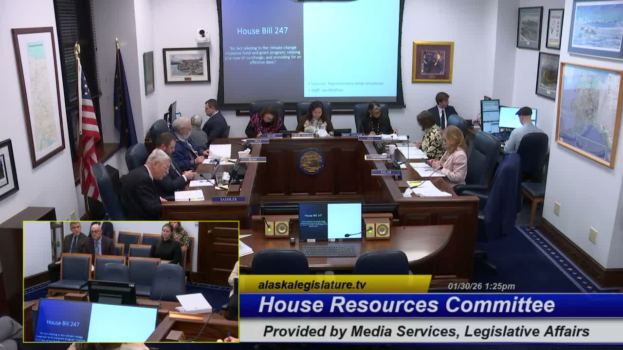 Representative Andy Josephson introduced HB247 at the House Resources Committee hearing on Jan. 30, 2026 in Capitol Room 124, proposing a 20¢ per taxable barrel surcharge to fund a new climate change response program administered by the Department of Environmental Conservation (DEC).