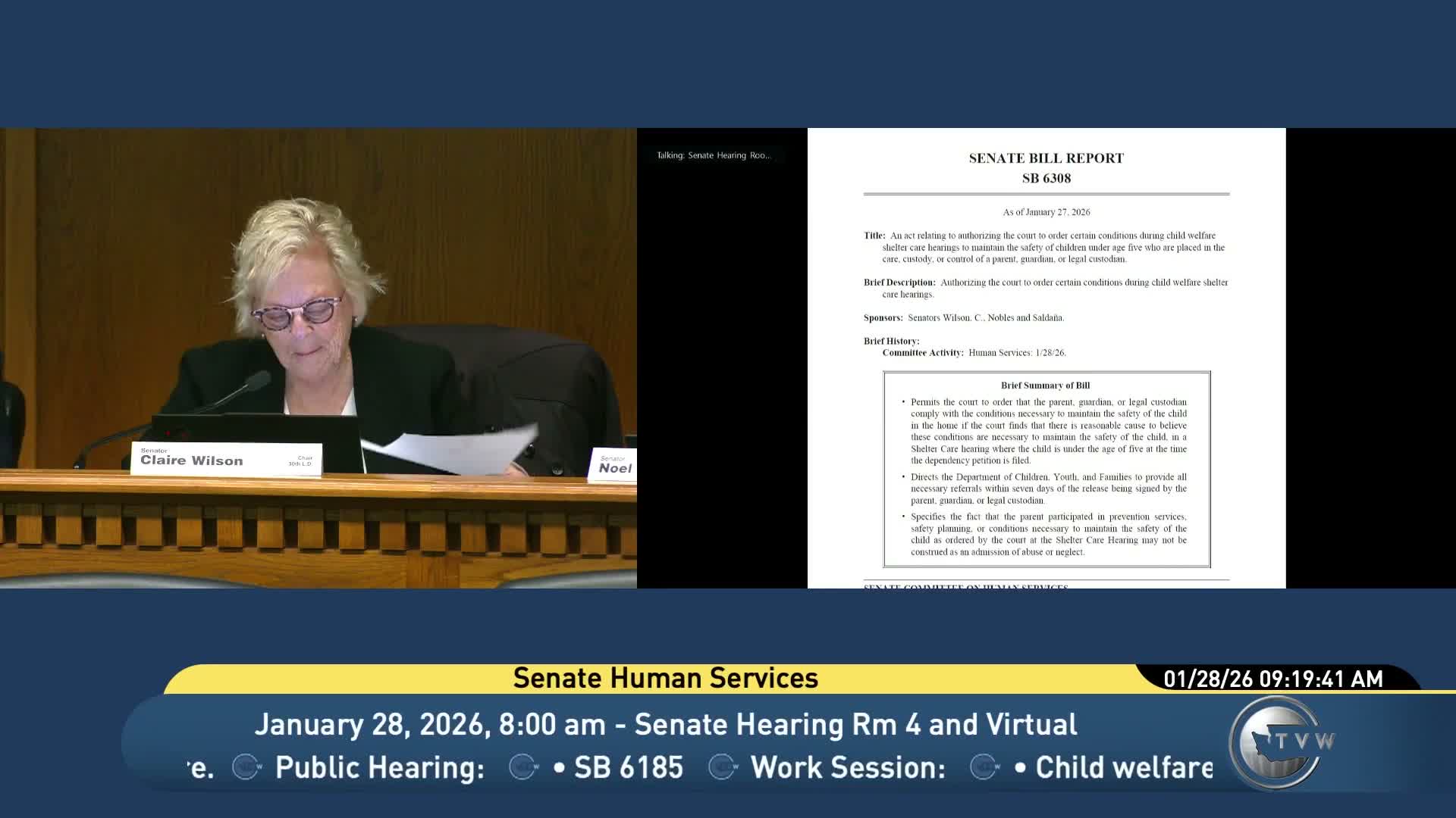 Senate Bill 6,308, briefed and discussed during the committee’s morning session, would authorize courts at shelter‑care hearings to order certain conditions — including participation in services or evaluations — when the court finds reasonable cause that such conditions are necessary to maintain the child’s safety in the home. The bill would also prohibit courts from treating participation in services ordered at shelter care as an admission of abuse or neglect at a later fact‑finding hearing and instructs DCYF to provide referrals within seven days.