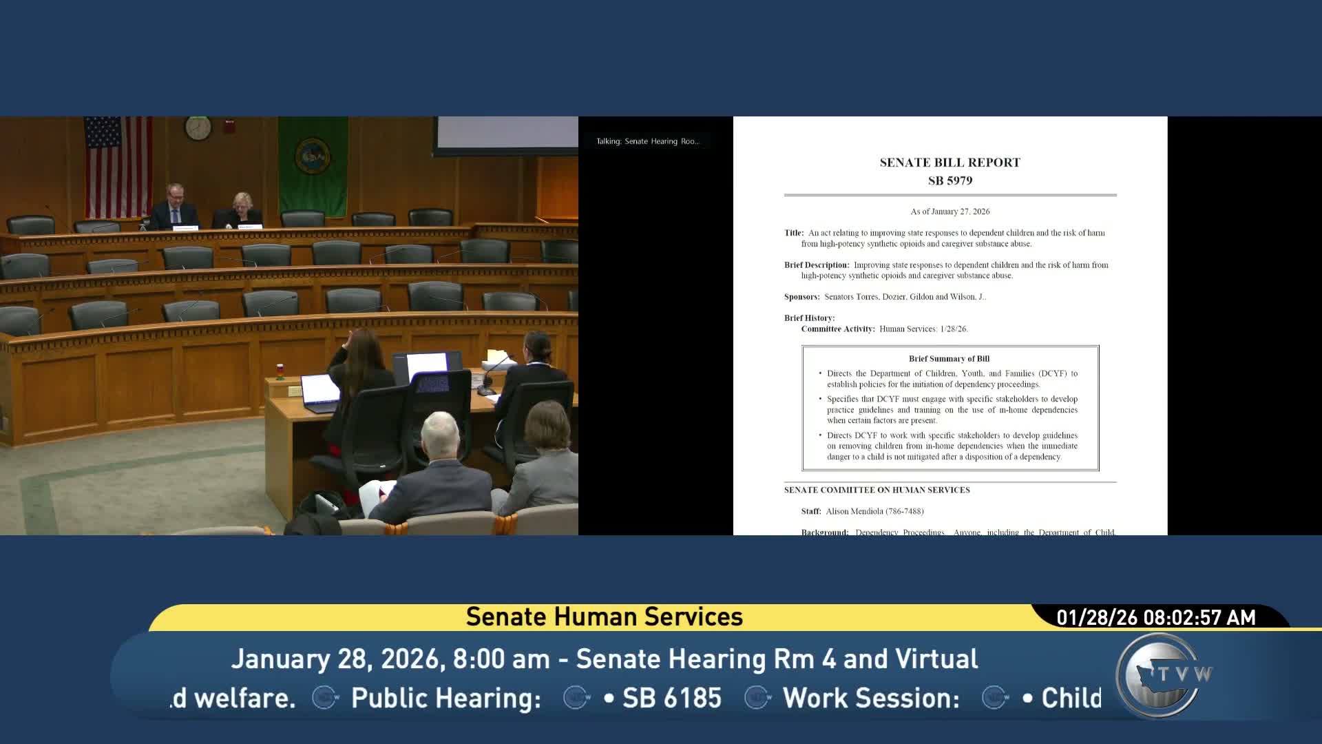 Senate Bill 5,979, sponsored by Sen. Nikki Torres, was the first bill the Senate Human Services Committee briefed on the morning of Wednesday, Jan. 28, as lawmakers focused on child welfare responses to a rise in fentanyl‑related critical incidents. The bill would require the Department of Children, Youth and Families (DCYF) to work with judicial officers, court administrators and child‑welfare professionals to develop practice guidelines and trainings for the use of in‑home dependency proceedings and to weigh the presence of high‑potency synthetic opioids when initiating dependency proceedings.