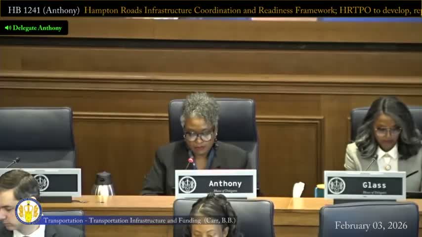 Del. Anthony’s substitute for HB 12‑41 would have the Hampton Roads Planning District Commission develop a regional and fiscal readiness framework for multimodal infrastructure; the subcommittee reported the substitute to appropriations and the bill moved forward 9‑0 after a friendly amendment to include urban roads.