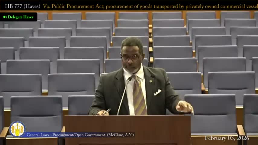 Delegate Hayes presented HB 777 and a substitute that preserves a provision added to the Virginia Public Procurement Act addressing procurement of imported goods and the use of privately owned commercial vessels. Committee counsel explained the substituted language defines "privately owned commercial vessel" and directs a state agency that enters a public contract for goods exceeding $10,000 to include contract provisions requiring the contractor to comply with applicable provisions of the Merchant Marine Act regarding use of privately owned commercial vessels for transporting those goods.