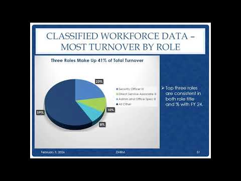 Lawson said turnover fell to 12.8% in FY25 and average time to hire decreased from about 78 to 68 days. She attributed earlier spikes in vacancy and turnover data to discrepancies created during the migration from the legacy PMIS system to Cardinal HCM and described a July–August data‑cleanup effort that adjusted reported vacancy figures.