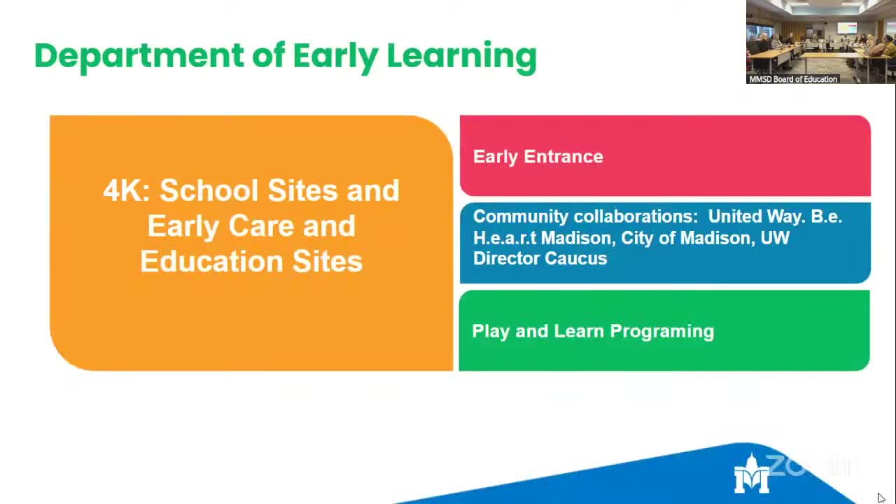 The Madison Metropolitan School District presented an early‑learning update on proposed 4K expansions and the Play & Learn family education program, framing both as central to the district’s FY27 budget planning and longer‑term enrollment strategy.