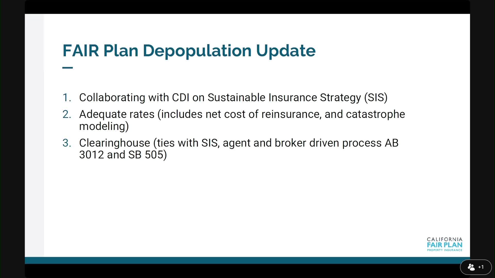Industry witnesses including the Personal Insurance Federation and the Farm Bureau urged making the clearinghouse and commercial clearinghouse work better to reflect parcel-by-parcel risk and to improve appointment or access rules. Roach acknowledged the clearinghouse is a barrier that limits movement and said some policy transfers have occurred (industry brokers reported about 200 moves), but that there is no built-in way for the Plan to force transfers.