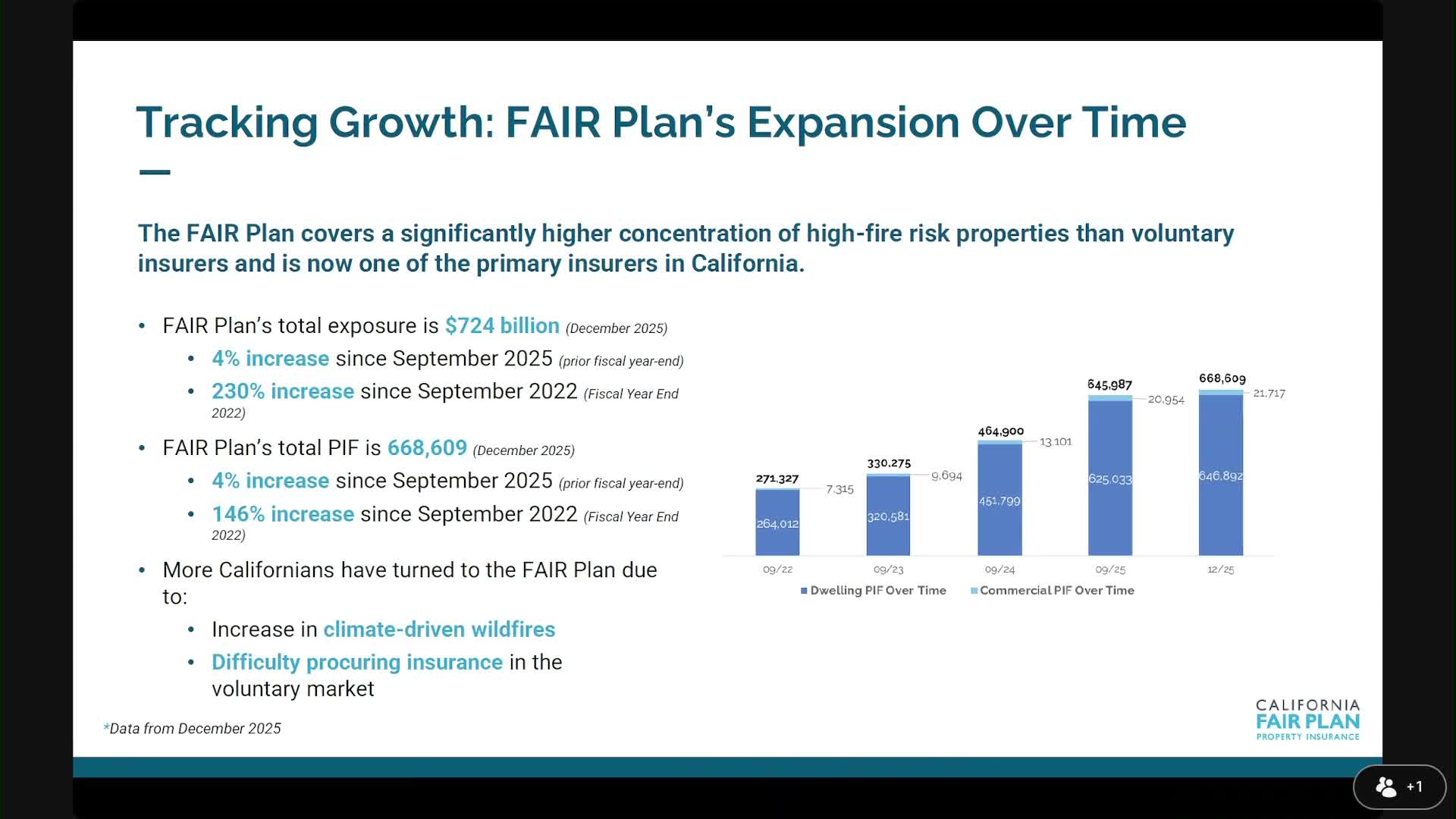 Victoria Roach, president of the California Fair Plan, told lawmakers the Plan’s exposure is roughly $724 billion and its book includes just over 668,000 policies. She said the Plan wrote about 49,000 new policies in the first fiscal quarter after the 2025 fires and that growth has slowed but remains high.