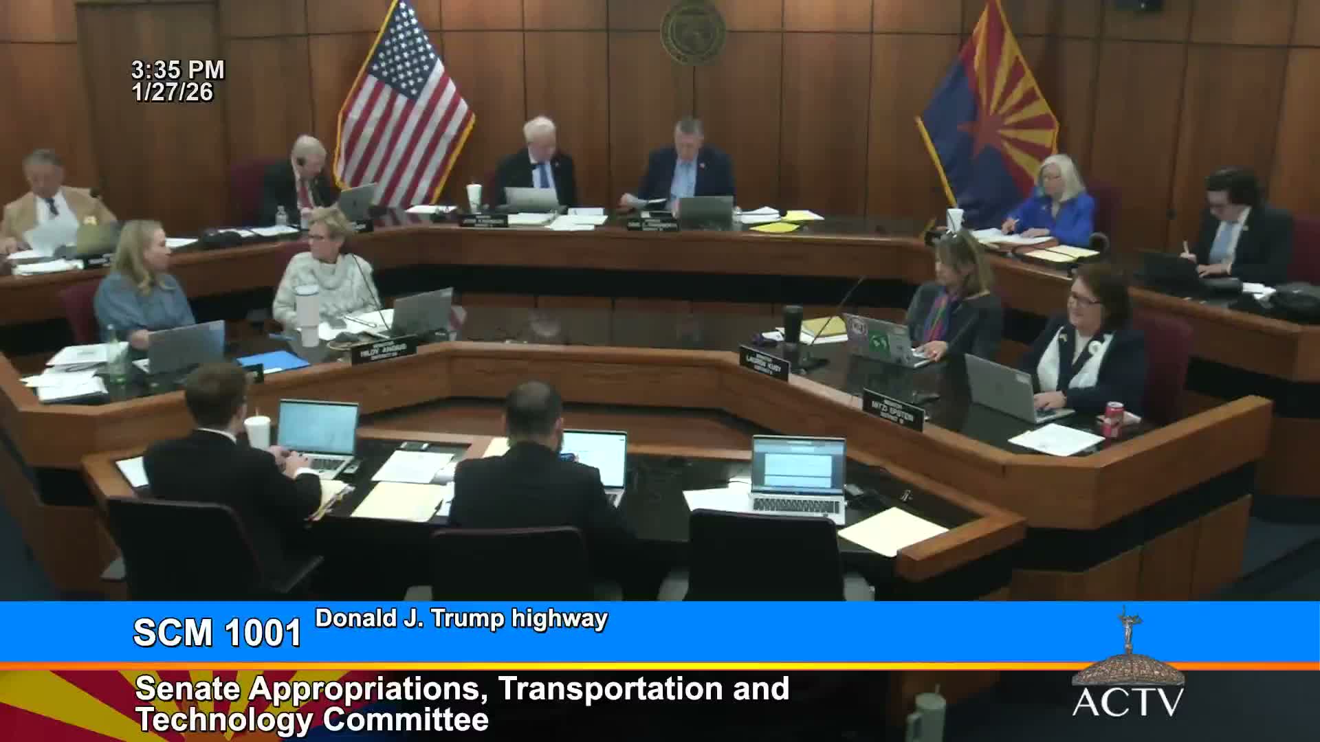 Senate Concurrent Memorial 1,001, which urges the Arizona Department of Transportation to rename State Route 260 as the "Donald J. Trump Highway," was amended to assign naming authority to the state board on geographic and historic names and received a due‑pass recommendation from the committee.