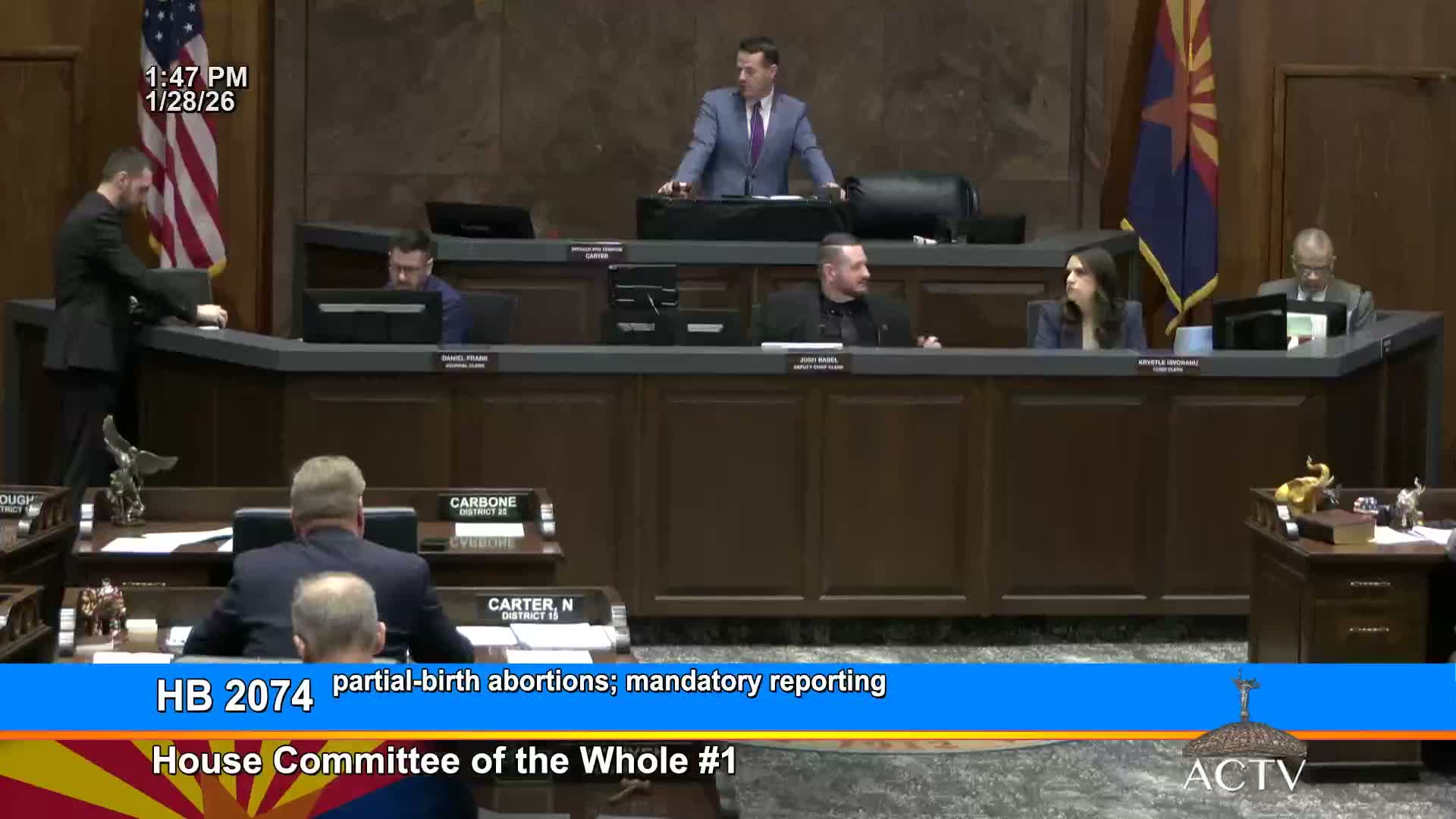 On Jan. 28, 2026 the Arizona House, in Committee of the Whole, recommended HB2074 (mandatory-reporting changes related to a ban on partial-birth abortion) and HB2148 (a transparency bill) do pass as amended; both measures were ordered to engrossing by voice vote.