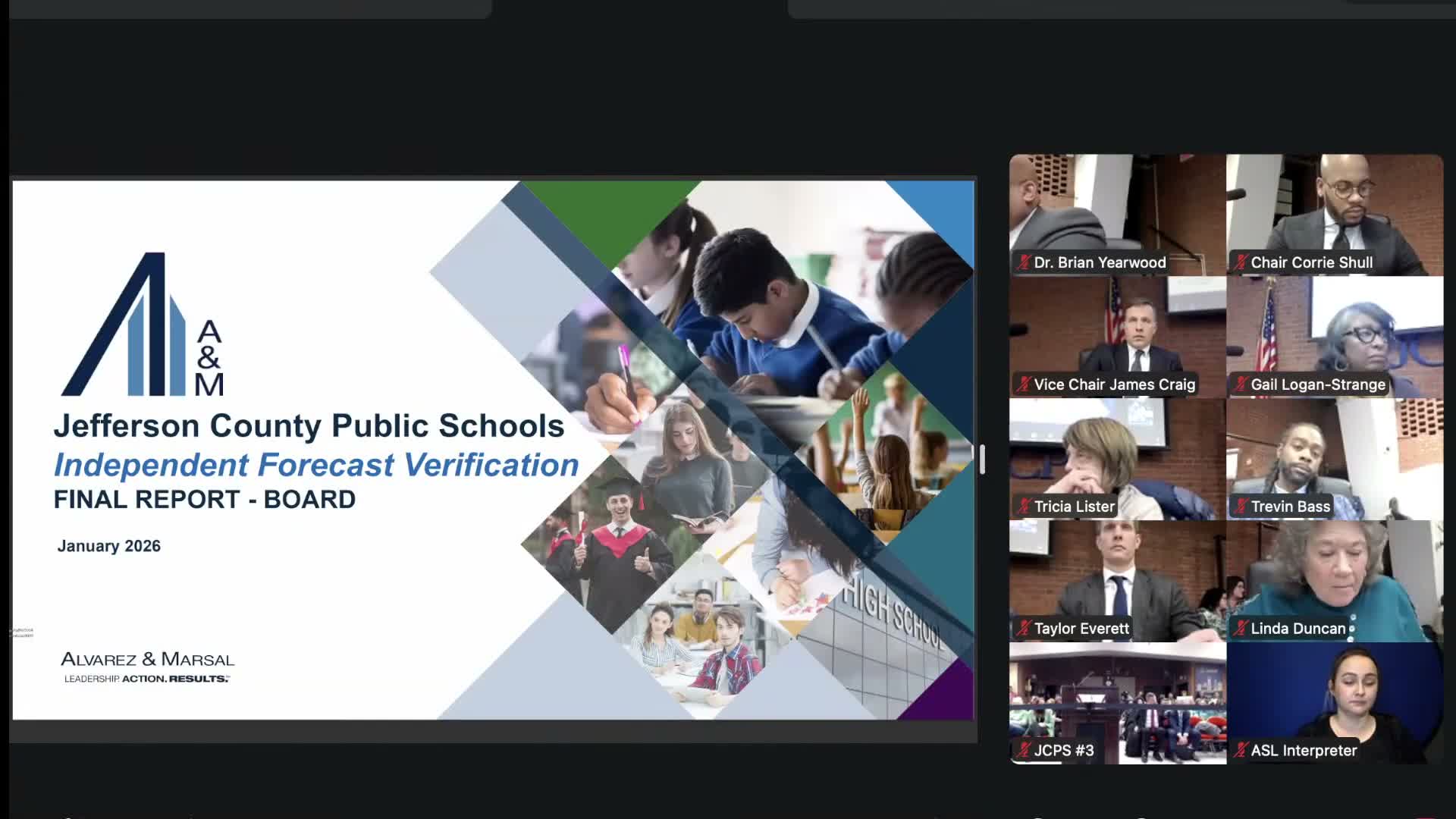 Consultants from Alvarez & Marsal presented an independent verification of Jefferson County Public Schools' multiyear forecast model at the board's Jan. 20 meeting, telling trustees the tool gives reliable short-term cash-flow information but lacks the granularity for precise multi-year budgeting and policy-making.
