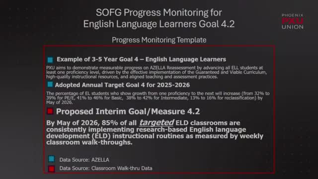 The goals — billed as interim measures tied to the district's Goal 4 for English learners — set targets for classroom implementation and formative growth. "By May 2026, 85 percent of all targeted ELD classrooms are consistently implementing research-based English language development instructional routines as measured by weekly classroom walkthroughs," a volunteer read aloud during the meeting. Leaders also proposed a target for integrated content classrooms and a Flashlight 360 benchmark for measurable fall-to-spring student growth.